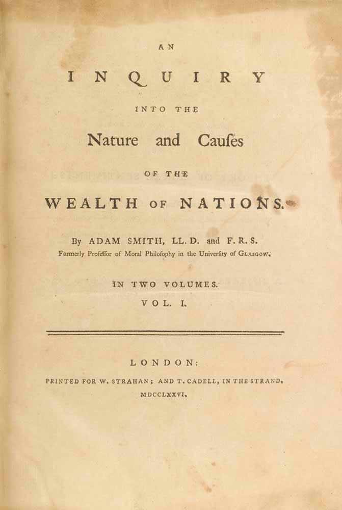 Eastland will also be contributing to Swann’s June 18 Fine Books & Manuscripts sale. One find is a first edition of Adam Smith’s Wealth of Nations from 1776, with a contemporary note in the hand of William Alexander (Scotsman, associate of Benjamin Franklin, and later immigrant to Virginia), viz., “These two volumes were gifted to W:A: by the author, before publication with a handsome compliment in Mr. Smith’s writing which was cut out by a stupid French bookbinder & could not be found, he having destroyed it as sullied paper & substituted this clean leaf in place of it.”