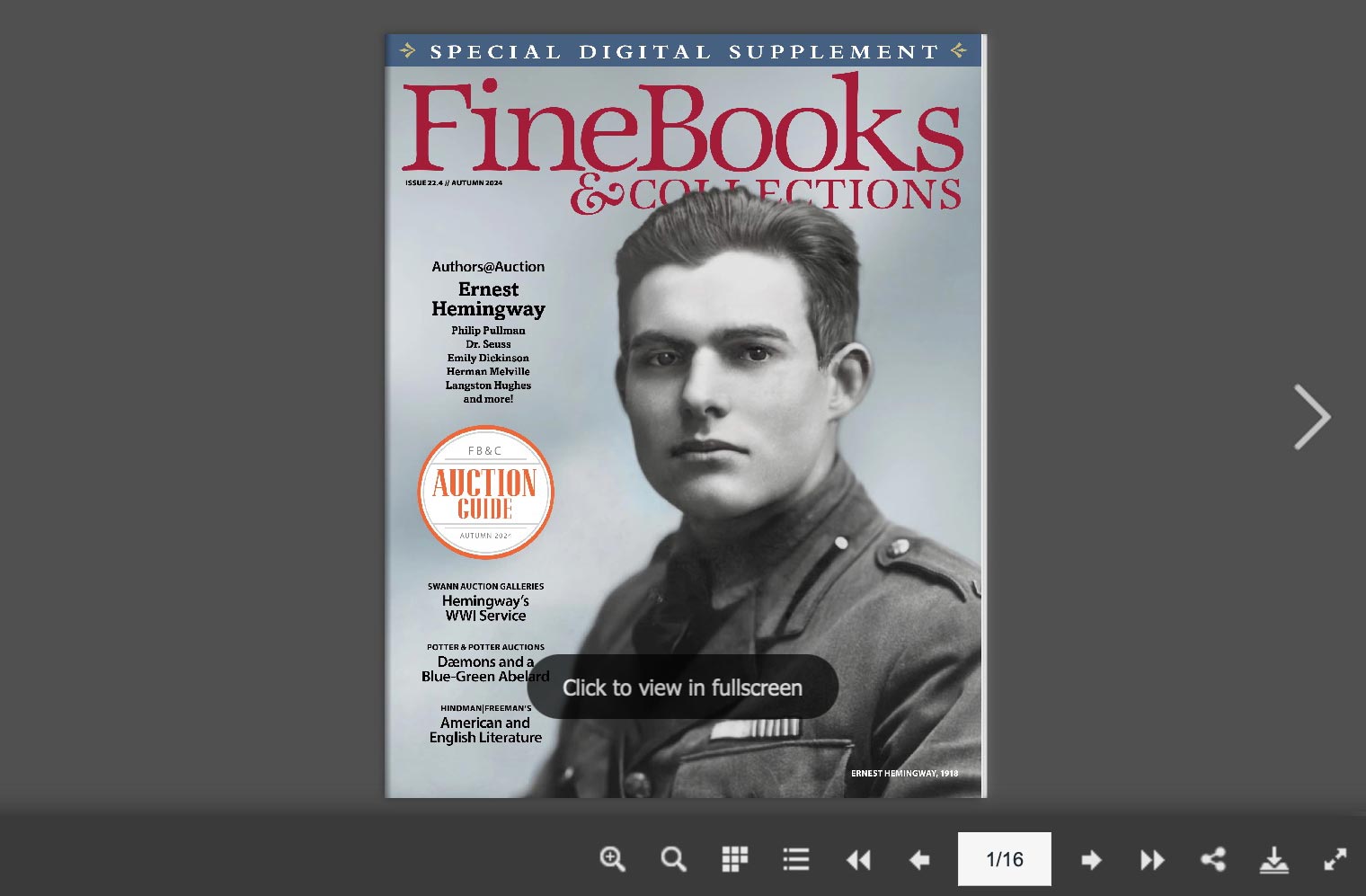 Auction Guide Autumn 2024 Download this IssueSwann GalleriesHemingway’s WWI Service Potter & PotterDæmons and a Blue-Green AbelardFreeman’s | HindmanAmerican and English LiteratureSold@AuctionA roundup of rare Books, photographs, ephemera, and more