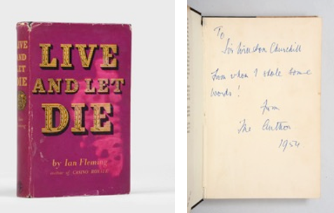 A presentation first edition of Live and Let Die (1954), inscribed by Ian Fleming to Winston Churchill: “To Sir Winston Churchill, from whom I stole words! From the author. 1954.”