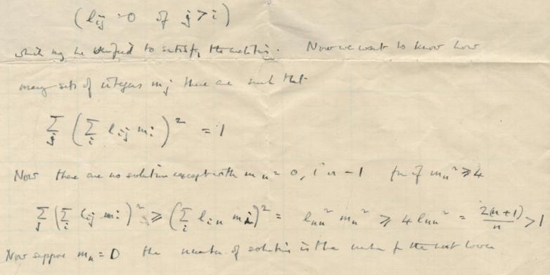 The calculations – which set out and analyse a problem in n-dimensional geometry – were written in ink on two pages of mathematical paper and discovered among the papers of Rolf Noskwith who worked alongside Turing in Hut 8 at Bletchley Park from June 1941 until the autumn of 1942 when Turing left for America to assist the US Navy's codebreakers. The undated pages had been folded in two and ROLF scribbled on the back.