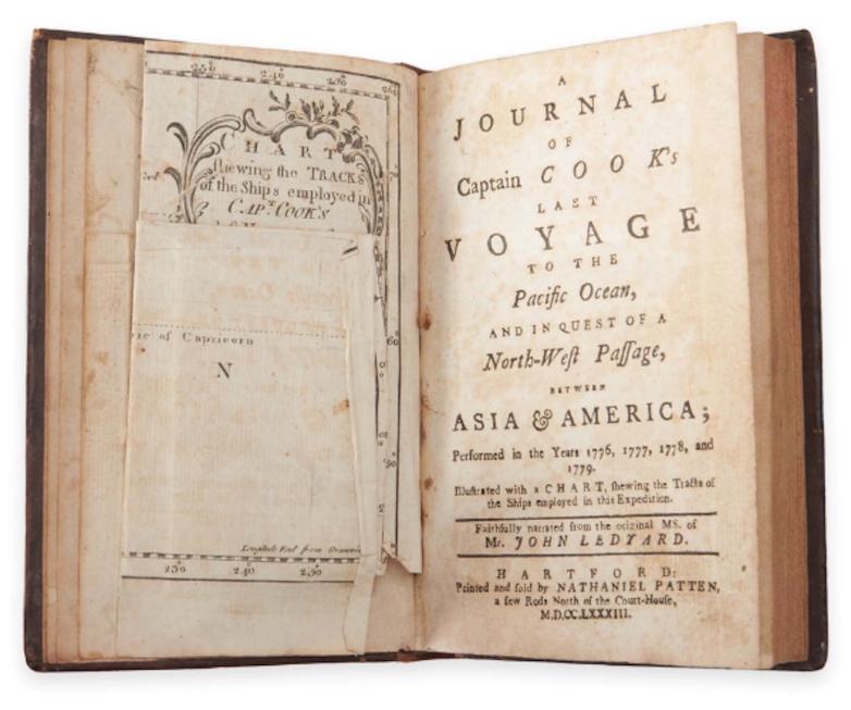 A Journal of Captain Cook's last voyage to the Pacific Ocean, and in quest of a North-West Passage, between Asia & America, 1783 by John Ledyard (1751-1789), estimated at $50,000 – 75,000.