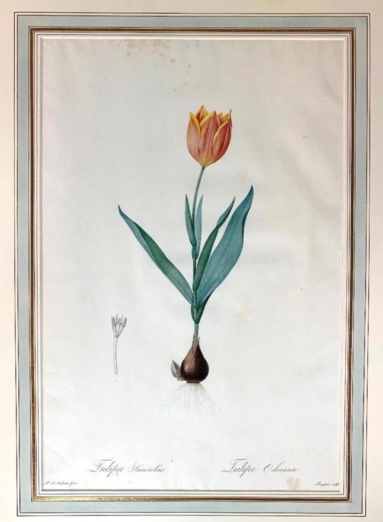 Stipple engraving, hand finished, by Pierre Joseph Redoute (French 1759-1840), titled Tulip Suaveolens, Tulip Odorante, circa 1802-1816, matted (est. $2,000-$3,000).