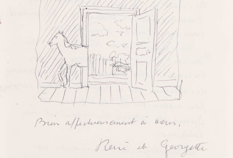 Highlights include an autograph letter signed by René Magritte written in 1962 to art historian Suzi Gablik. Magritte talks about critics in the letter, muses on his exhibitions in Knokke and Minneapolis, and complains about his short-lived Lancia Flavia automobile. He also includes a surrealist sketch for a new painting, depicting an open doorway and half a horse.