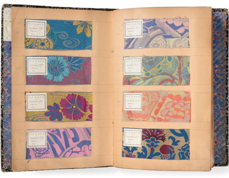 While most of the books are anonymously created bound volumes showcasing silk, velvet, and cotton swatches, two notable manufacturers are represented, including Bianchini Férier, who supplied fabric and created designs for haute couture houses Givenchy, Chanel, Dior, and Balenciaga. The majority of the books hail from Lyon, considered the epicenter of the French textile industry for centuries. “The textile industry in France from 1850-1950 was known as the Second Industrial Revolution; Paris became the hub of textile design, colour forecasting and trend setting. By the 1920s and 30s, sample books were employed to communicate new designs, trends and the latest textiles around the world,” said Tennants.
