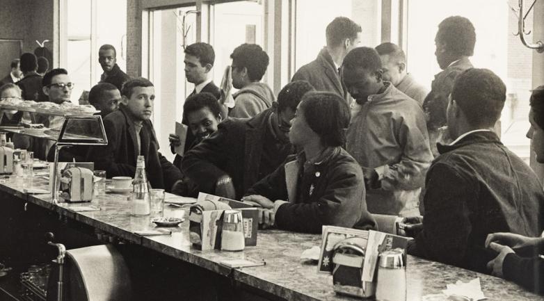Danny Lyon, SNCC Staff Sit-In, Atlanta, John Lewis behind Mendy Samstein (+ the pastries), Stokely Carmichael standing at right, together with The Movement, silver prints, 1963-64, 1969. Estimate: $10,000-15,000