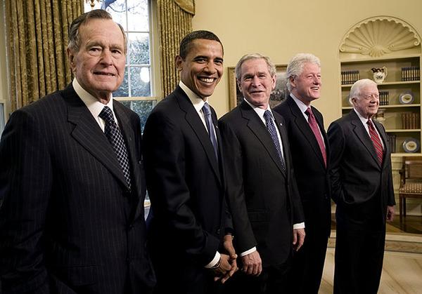David Hume Kennerly, George H.W. Bush, Barack Obama, George W. Bush, Bill Clinton and Jimmy Carter, United States Presidents Gather Two Weeks before Barack Obama's Inauguration, Oval Office of the White House, Washington, D.C., 2009.