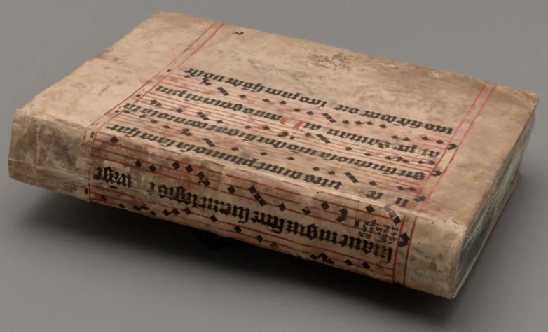 Andreas Vesalius, De humani corporis fabrica, 1543, concealed in a binding made from a medieval antiphonal leaf