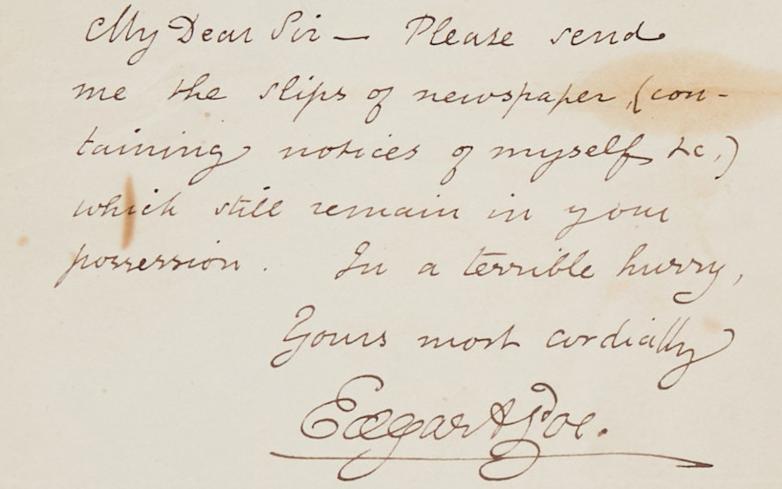 A letter written by Edgar Allan Poe (1809-1849) was the sale’s top lot