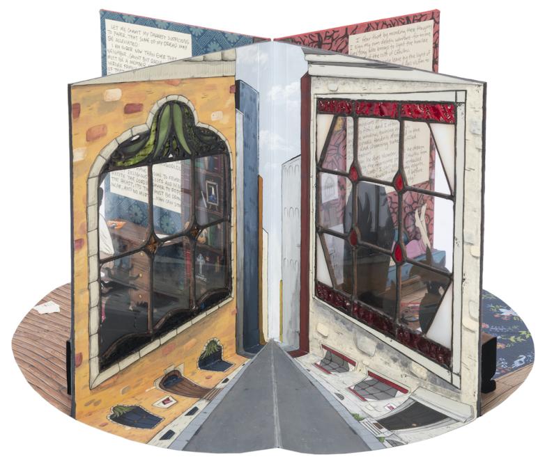Batsel’s unique book is one of several headed to auction on August 28, estimated at $700-1,000. It was consigned by the Caxton Club, Chicago’s book collector’s club, which commissioned several pieces for its 125th anniversary. The books and specialty bindings created by artists Ben Blount, Sam Ellenport, Lesa Dowd, Jennifer Farrell, Mardy Sears, and Batsel took their cue from the club’s latest publication, Chicago by the Book: 101 Publications that Shaped the City and Its Image, and were presented to the club this past June. According to club president Jackie Vossler, “The club was awed by the contributions but is now offering them at auction in order that we may fund our continued charitable programs.” Those programs include scholarships and grants for book artists.