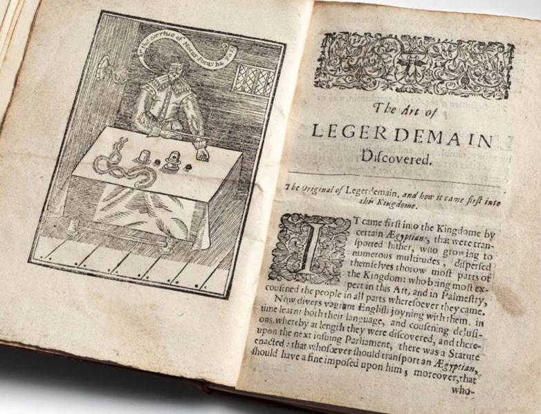 Hocus Pocus Junior. The Anatomy of Legerdemain. Or, The Art of Juggling set forth in proper Colours. London: Printed by G. Dawson, 1663. The sixth edition, “with many additions.” One-third smooth calf over marbled boards, spine banded in gilt with date at foot and gilt-stamped title label. 32 leaves, unnumbered. Woodcut frontispiece, woodcuts in text. Dawes and Findlay bookplates. One of two known examples of this edition.