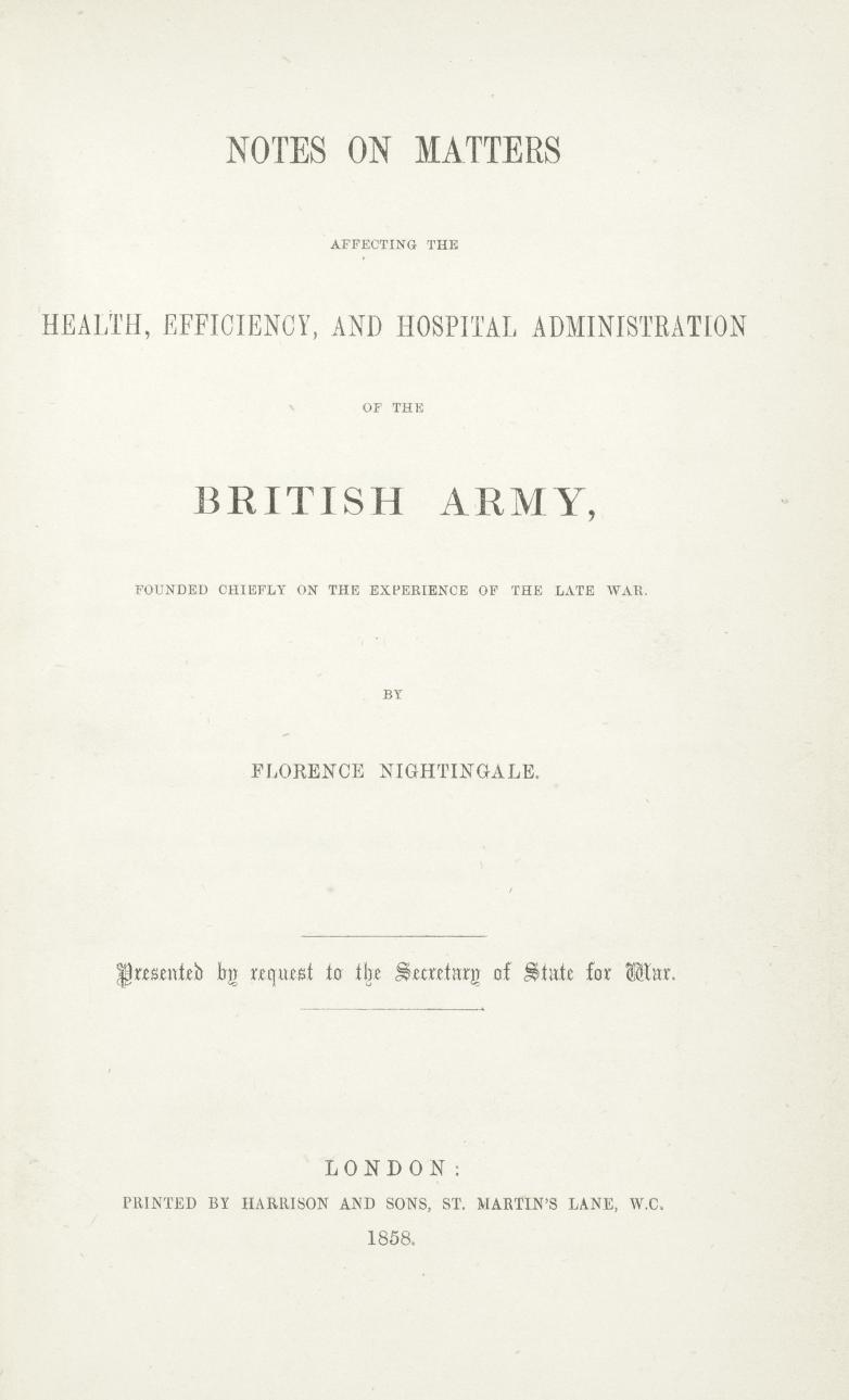 The report exposed the horrific statistic that 16,000 of the 18,000 deaths in the Crimea were due to preventable diseases caused by poor sanitation and nursing practices. Nightingale had submitted these figures, together with detailed recommendations for reform, to the Royal Commission into Military Hospitals, set up by the Secretary of State for War, Lord Panmure, at her prompting. When the Government’s report was published earlier in 1858, many of Nightingale’s suggestions were adopted, but the statistics on death and disease were omitted Nightingale sent this copy with a hand-written letter to her banker and supporter Edward Marjoribanks, who had served as a trustee of The Nightingale Fund, set up in 1855 to raise money to establish a training institute for nurses. Although Nightingale requested that her report be kept confidential, it would seem that she hoped and expected that the contents would leak out and influence public debate.