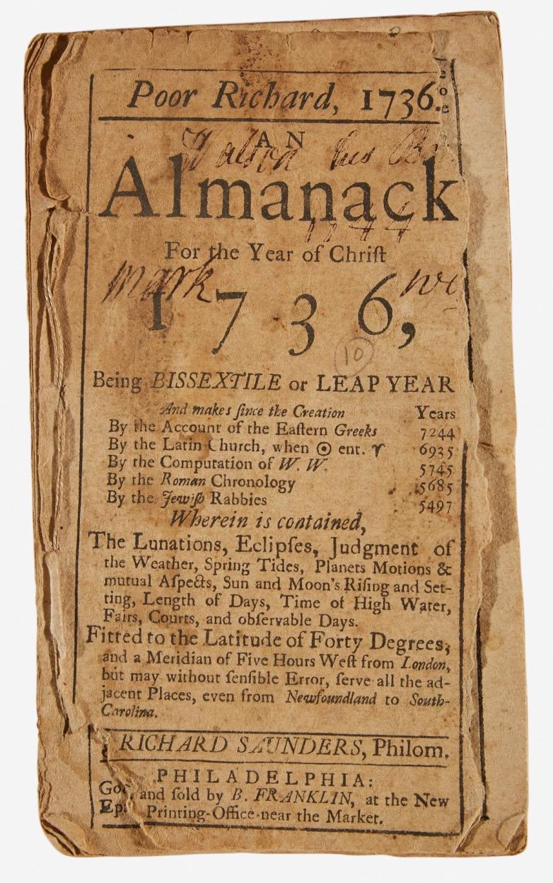 Befitting Philadelphia’s auction house, Freeman’s presents outstanding sales of a suite of books printed by Benjamin Franklin in Philadelphia. A number of lots kicked off the auction with competitive bidding, including rare Poor Richard almanacs, all of which well outperformed their pre-sale high estimates. Poor Richard, 1736. An Almanack For the Year of Christ 1736…(Lot 10; estimate: $3,000-5,000) sold for an impressive $17,640, as did Poor Richard Improved…(Lot 12; estimate: $5,000-8,000). Lot 11, A Pocket Almanack For the Year 1761, achieved $10,080 (estimate: $5,000-8,000). A copy of Cato Major, or his Discourse of Old-age: With Explanatory Notes, sold for $11,970 (Lot 5; estimate: $5,000-8,000). These impressive results underscore Freeman’s pride of place in presenting Philadelphia-related material.
