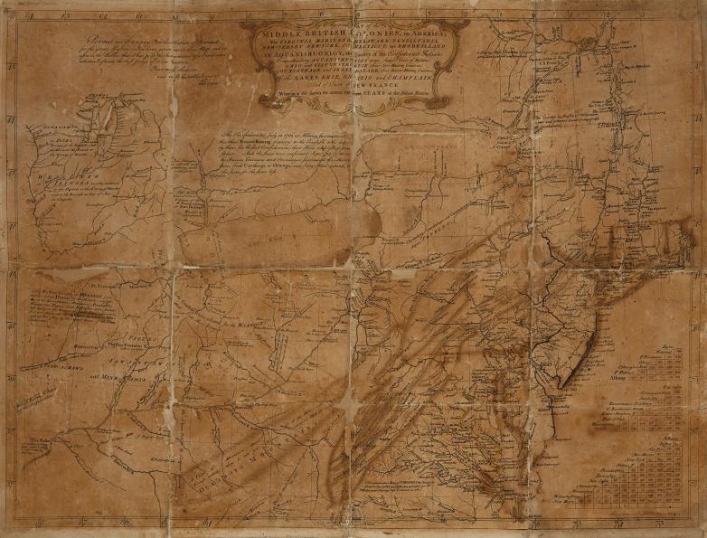 Lewis Evans, A General Map of the Middle British Colonies in America, proof copy, annotated, signed & dated by Evans, Philadelphia, May 2, 1755. Estimate $30,000 to $50,000.