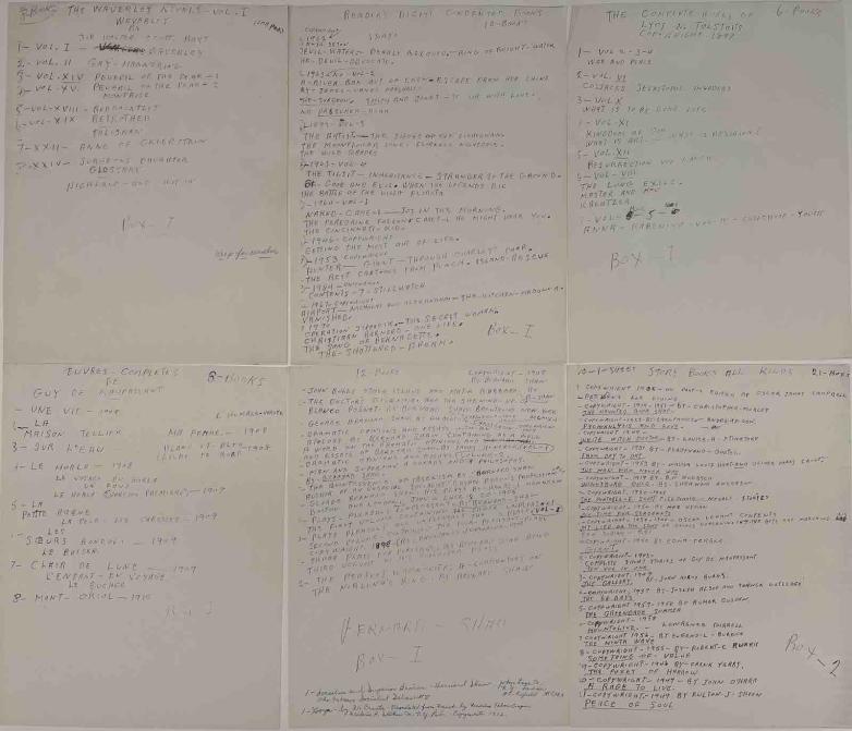 At some point, Smitty decided to create a catalog of his collection. Not having any bibliographic training, he focused on recording just the titles, authors, and copyright years. He didn’t try to put them in any formal order, simply recording them by the box that held them, for a total of 349 books in ten boxes listed on 29 hand-written, one-sided pages. Someone else – his wife, Joyce? Another family member? – finished the catalog on an additional 7 pages, listing another 90 volumes.