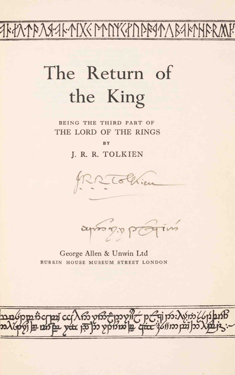 Each volume of the trilogy (various impressions) is signed by the author, with The Return of the King additionally signed by Tolkien "jon r. r. tolkien" in Elvish Tengwar script. The estimate is £10,000 - £15,000.