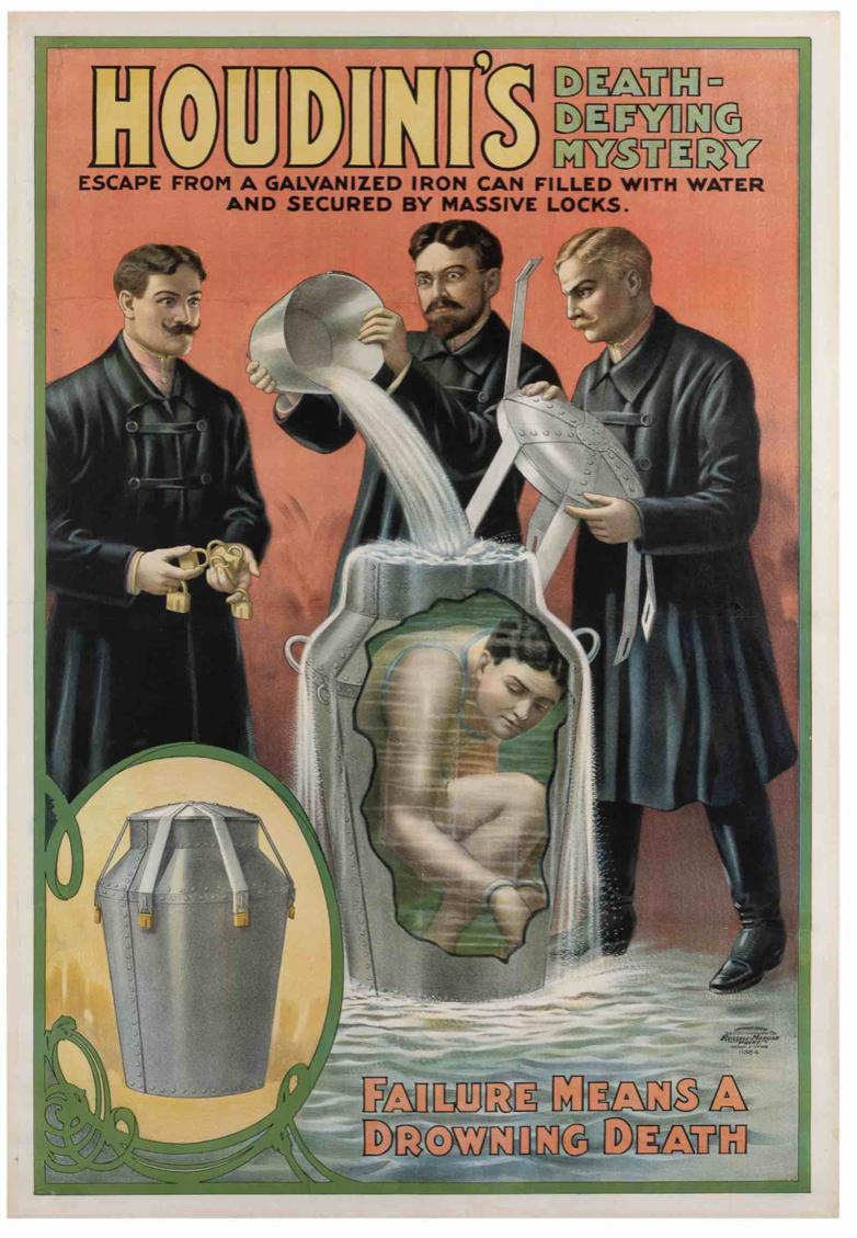 This linen backed rarity, one of perhaps five extant, measures 40" x 30” and was published in Cincinnati & New York by Russell-Morgan Litho. in 1908. This one sheet color stone lithograph depicts Houdini in his Milk Can escape, crouched down inside the metal container with water pouring down over his body.