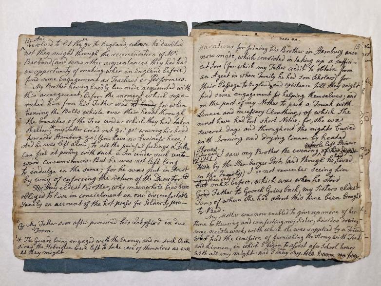 Izzy Wall, Assistant Curator and the member of staff who has researched the manuscript, explains: “The manuscript was written around 1836 when she was 86, and consists of handwritten text in English by Caroline (1750-1848), with occasional passages or words in German. The chapters contained in this draft cover the years 1755-75, a crucial period of Caroline’s life, from her childhood in Hanover to early years in Bath.