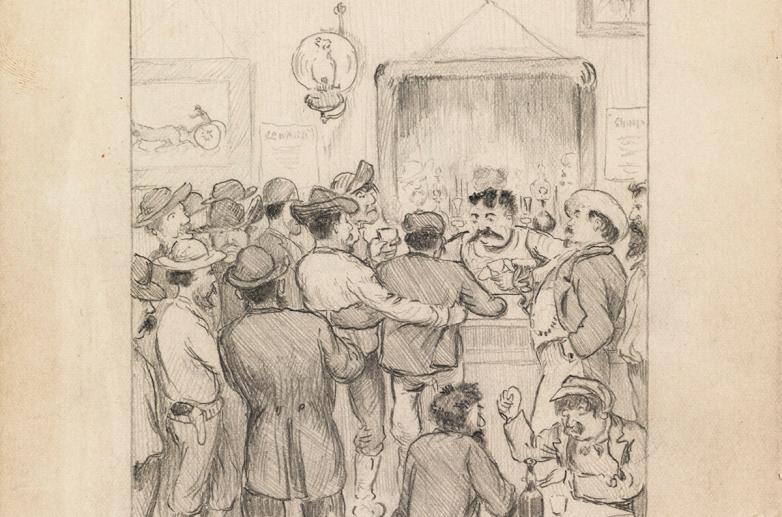 Also on Thursday at Swann Galleries, 387 lots of Printed & Manuscript Americana. A June 4, 1776 London impression of Bernard Romans' "An Exact View of the Late Battle at Charlestown, June 17th, 1775" rates the top estimate at $40,000–60,000. A first edition of the Book of Mormon (1830) with what are described as "early underlinings and marginal notes" is estimated at $30,000–40,000. This copy is noted as having been identified just last year in Wolfeboro, New Hampshire: note that the front board has been replaced. William Sydney Porter's illustrations for a never-published mining memoir by Joseph T. Dixon are estimated at $15,000–25,000.