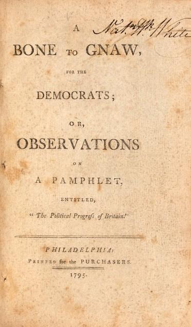 It is therefore extra exciting to see some Cobbett volumes among the offerings at Doyle, including a 1795 first edition of his A Bone to Gnaw, for the Democrats; or. Observations on a Pamphlet, entitled, "The Political Progress of Britain,” as well as a rare book by the vituperative journalist on the use of corn in papermaking.