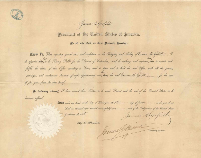 James Garfield appoints a female notary for the District of Columbia, June 9, 1881