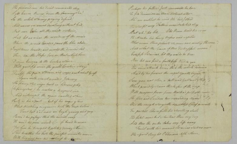 Born in West Africa and captured by slave traders as a child, Wheatley Peters became the first African American to publish a book of poetry with the 1773 release of her Poems on Various Subjects, Religious and Moral in London. A highlight of this acquisition is a four-page manuscript of a poem, Ocean, written in ink by Wheatley Peters' own hand, the only copy that exists today and previously unpublished before 1998. The poem was likely composed on her return voyage to America from England in September 1773.