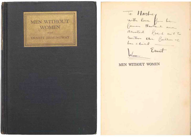 One book in my library that stands out for both its provenance and emotional resonance is a first edition of Men Without Women (New York: Charles Scribner’s Sons, 1927), inscribed in black ink: "To Hadley / with love from her former husband and devoted friend, not to mention the father of her child -- / Ernest." You will recall that Hemingway's divorce from Hadley Richardson was finalized in January 1927, following their separation in late 1926 due to his affair with Pauline Pfeiffer. The collection was published that October, making this particular copy and poignant inscription a powerful artifact from a deeply transitional moment in Hemingway’s life. —Taylor Kirkpatrick