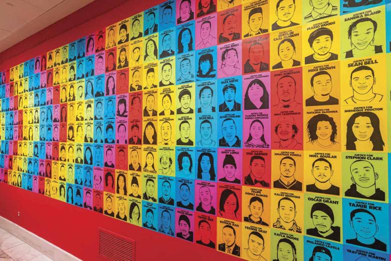 Their works draw on diverse creative springs from Pop Art to Dada, from Cuban to Chinese graphic traditions. Rupert García’s striking posters call attention to rights for Latinx and Black communities, underscoring solidarity in struggles. A graffiti-influenced screenprint by Richard Duardo commemorates Aztlán—the mythic Aztec homeland that ties Chicanx empowerment to indigenous origins. Ester Hernandez’s 1982 screenprint, Sun Mad, replaces the smiling girl on Sun-Maid raisin boxes with a calavera (skeleton) to denounce grape farmers’ exposure to toxic pesticides; in 2008, she printed Sun Raid, adding, among other symbols, a wrist bracelet to critique widespread immigration raids.