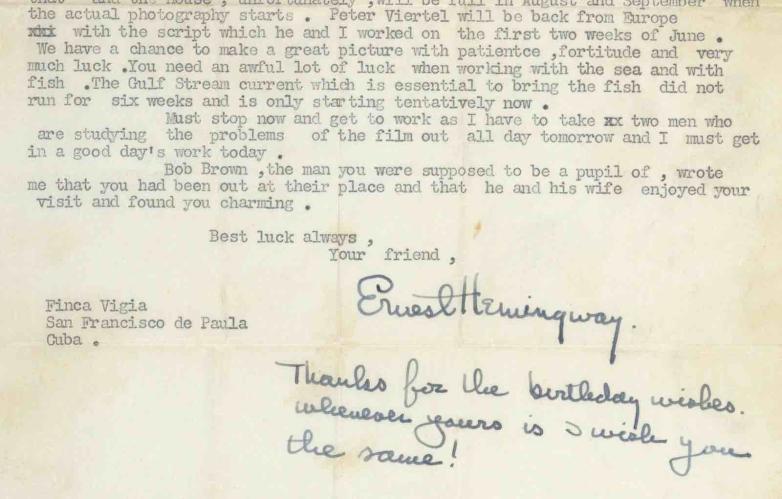 Later that year, Mary Lou wrote to the author to ask about a trip to Cuba that summer. Hemingway, who was filming The Old Man and the Sea, sent back a lengthy reply. After two recent plane crashes, the Nobel Prize winner ponders life and death In October of 1955, Mary Lou again reached out to Hemingway. He responded with another typed letter, this one referring to his fear of flying, manifested in his recent, nearly deadly crashes while on safari, as well as big game hunting, hurricanes, and a commentary on death and, remarkably, his belief in the afterlife. He urged her to be careful. “No second thoughts will help you and when you are dead you are dead for a long time.”
