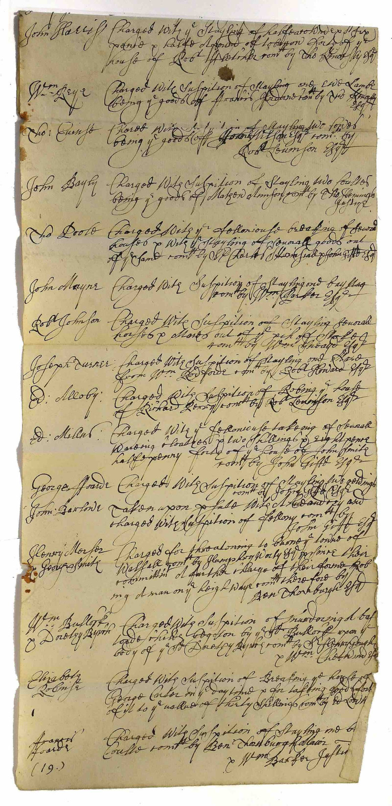 Early UK manuscript calendars of prisoners are exceedingly rare, and the lot comprised 42 lists dated between March 1661 and August 1688. They listed the details of prisoners and their charges, examples of which included: "Elizabeth Woolley alias Bell of Elford in ye County of Stafford upon suspicion of having two husbands", and "Ann Daybanck charged with murdering her daughter Dorothey Daybanck" as well as four men accused of being Popish Priests, and charges of burglary, highway robbery, stealing livestock, counterfeiting coins and more.