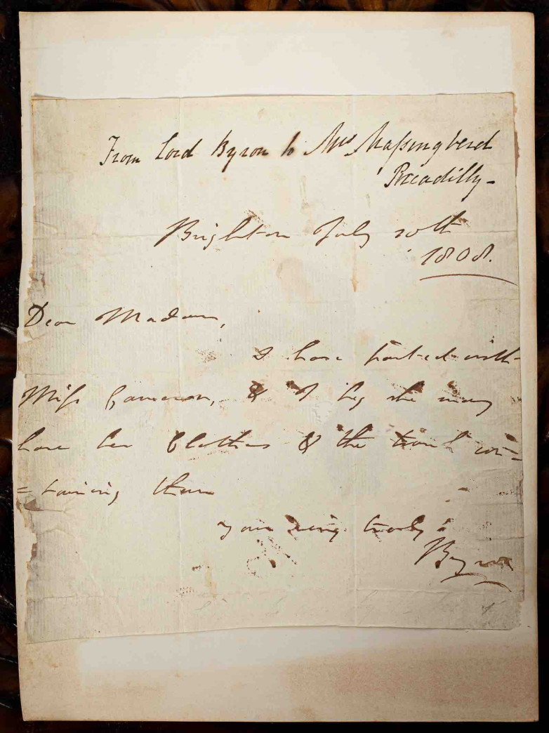 The first letter (estimate: £4,000 – £6,000), written from Trinity College, Cambridge, in December 1805, requests accommodation for Byron and his servant at Mrs Massingberd’s home at 16 Piccadilly. “I should prefer mixing with the family," he writes. "I should be unwilling to put you to the least trouble.” In fact, the relationship between Byron and the Massingberds was fraught as, acting as intermediaries with moneylenders on his behalf, they were frequently left exposed by Byron’s unpaid debts and by 1811 they faced the threat of imprisonment due to his unpaid borrowings.